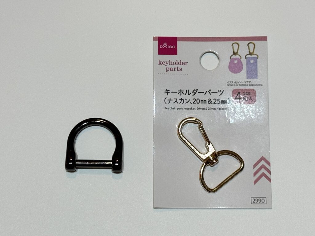 また、100均には手芸用品コーナーにこのようなキーホルダーパーツがあるので少し加工すれば代用することもできます。