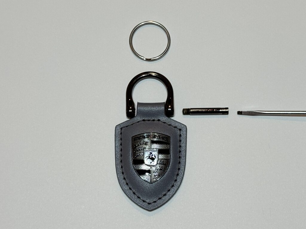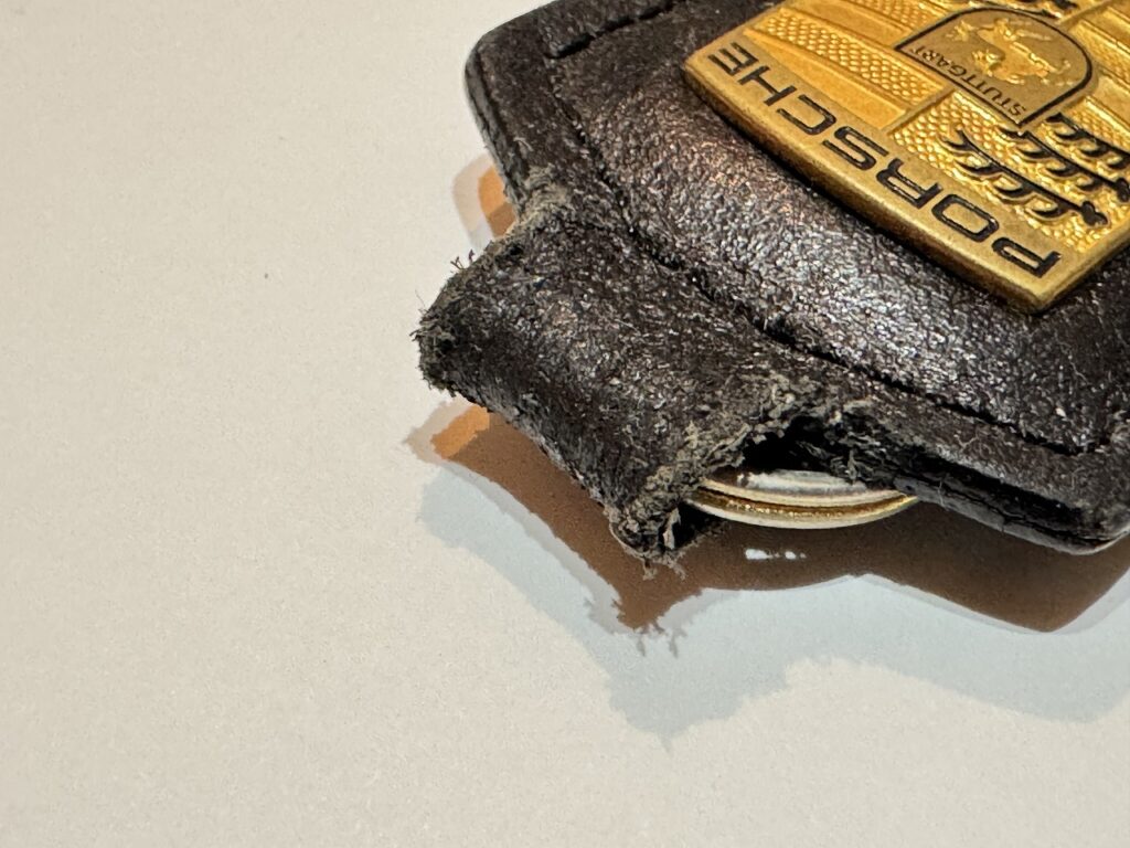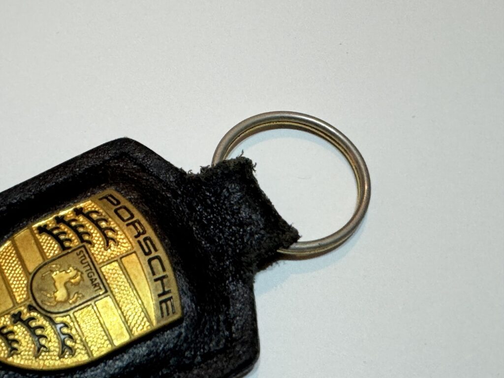 なぜかわからないけどポルシェのクレストキーホルダーって限定色や新色が発売されるたびに無性に欲しくなっちゃうんですよね。使わないのはもったいないからと思って大切に扱っていても気づかないうちに傷んでくるのがキーリングのところ。キーリングとレザーの形状がアンマッチだからだと思うんです。