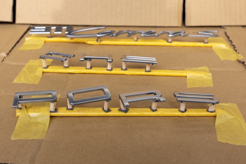 『PORSCHE』ロゴには各文字に位置決めの突起が2〜3カ所ずつあります